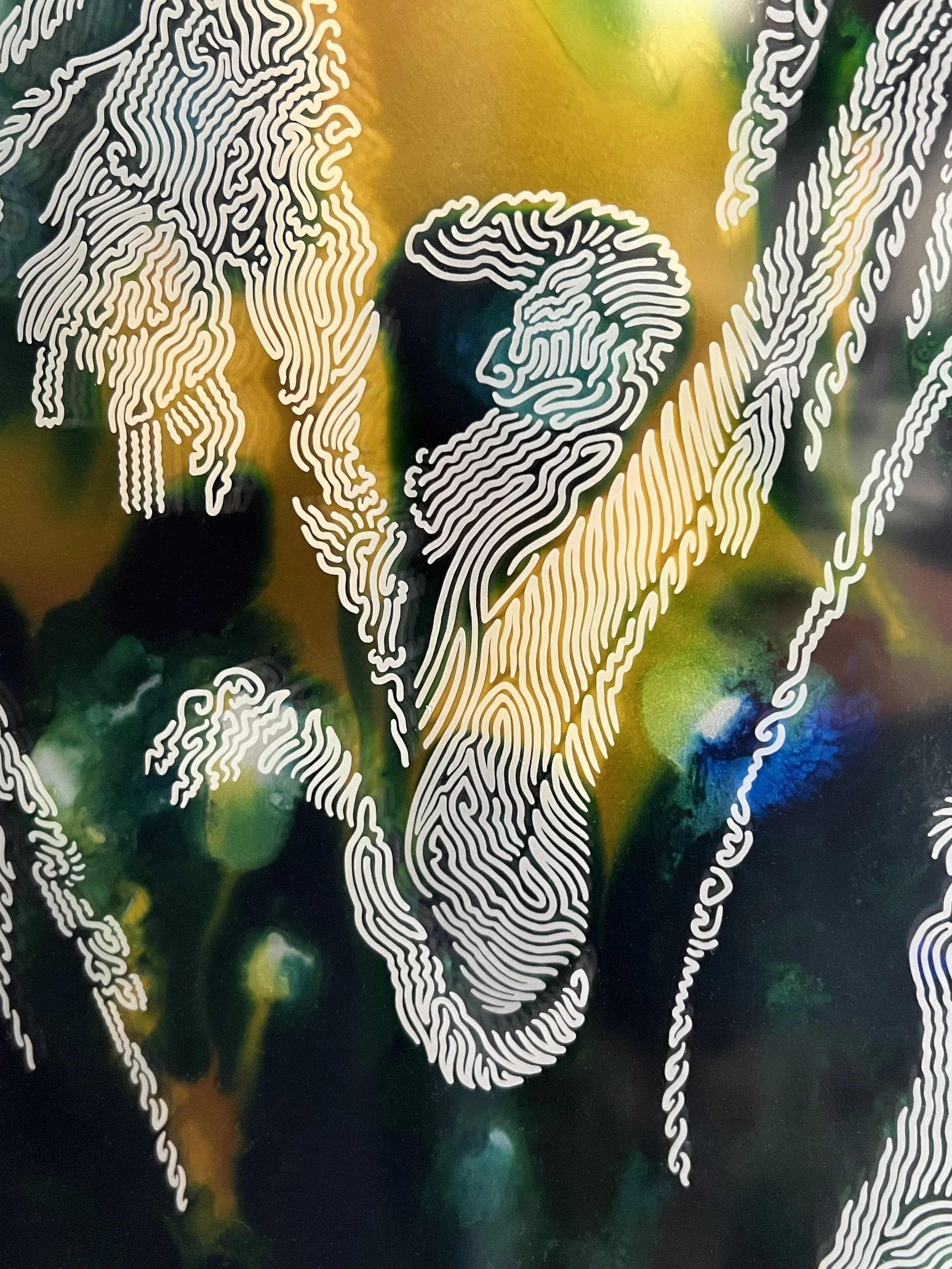 Projections is also the title of the body of work that Tenzer is exhibiting. Works in this series vacillate between standard painting sizes, and those of flat screen televisions, referencing two vehicles—one classical, one contemporary—of imagistic meaning-making. Materially the works are comprised of Plexiglas panels professionally etched with Tenzer’s automatist drawings, with an alcohol ink-stained Plexiglas backing board behind, separated by spacers to allow for a play of light and shadow, giving the work dimensionality despite the inherent flatness of the drawing.