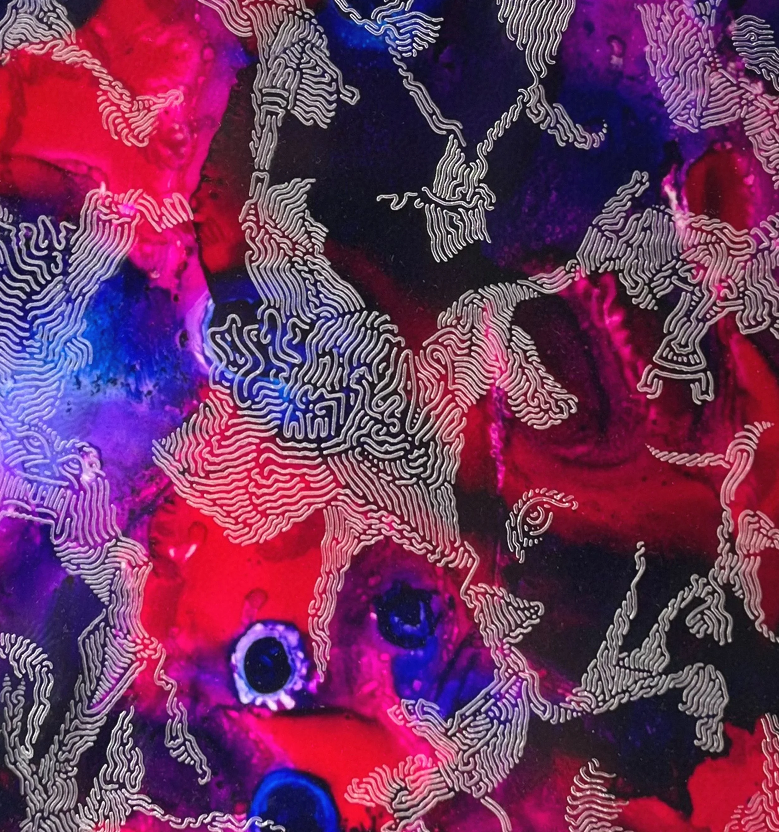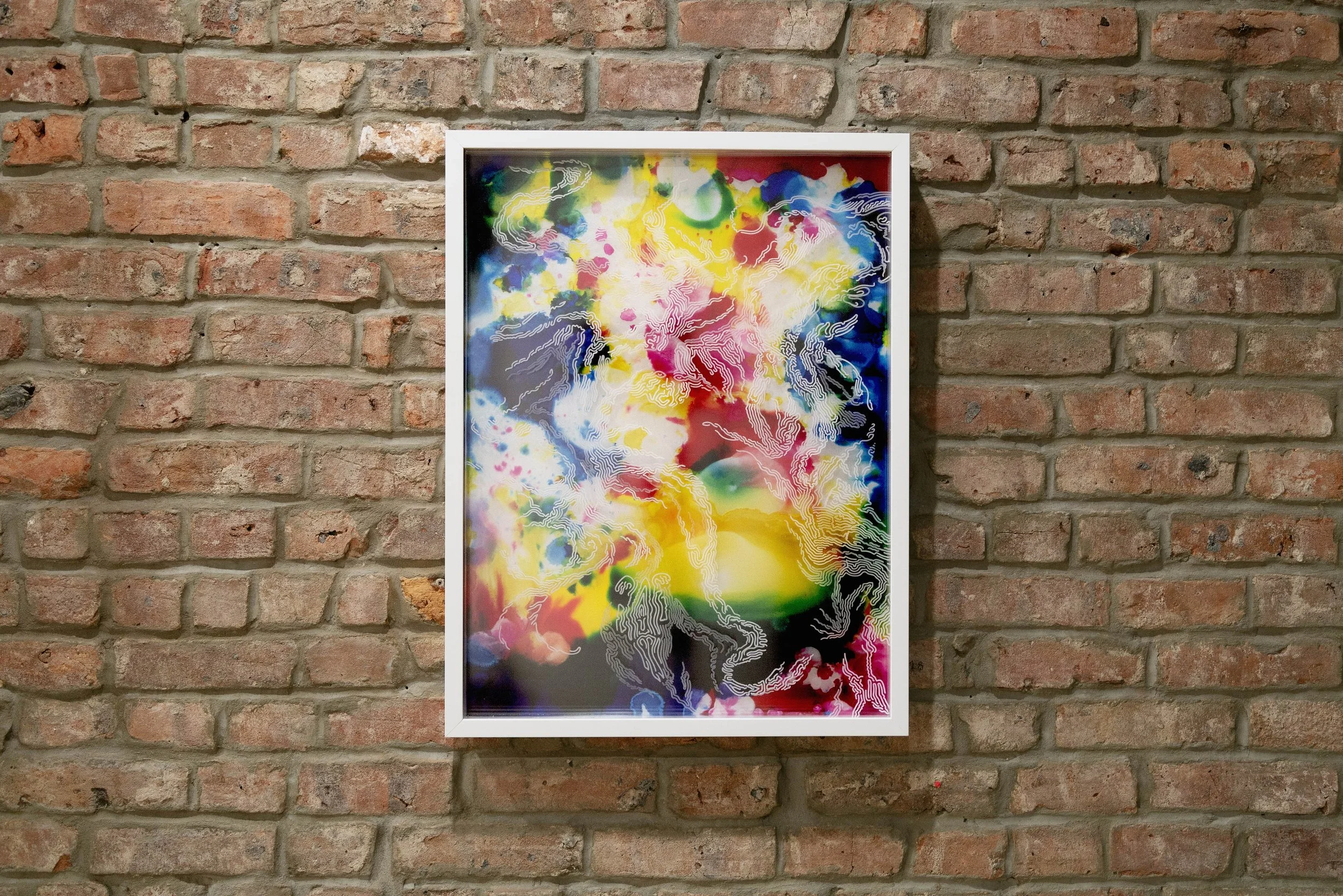 Tenzer always doodled, but during the covid-19 pandemic he began creating intuitive drawings to cope with feelings of loneliness and fear, which ultimately led to the current body of work. The Projections are shaped by the pandemic context they emerged from, such as the use of alcohol ink in reference to hand-sanitizer and the ubiquity of Plexiglas screens as protective devices, which Tenzer connected to the mediating element of iPhone screens, televisions, etc. His use of Plexiglas is thus also a reference to the various ways in which we perceive the world today through the lens of screens and the distancing effects such devices have on society.